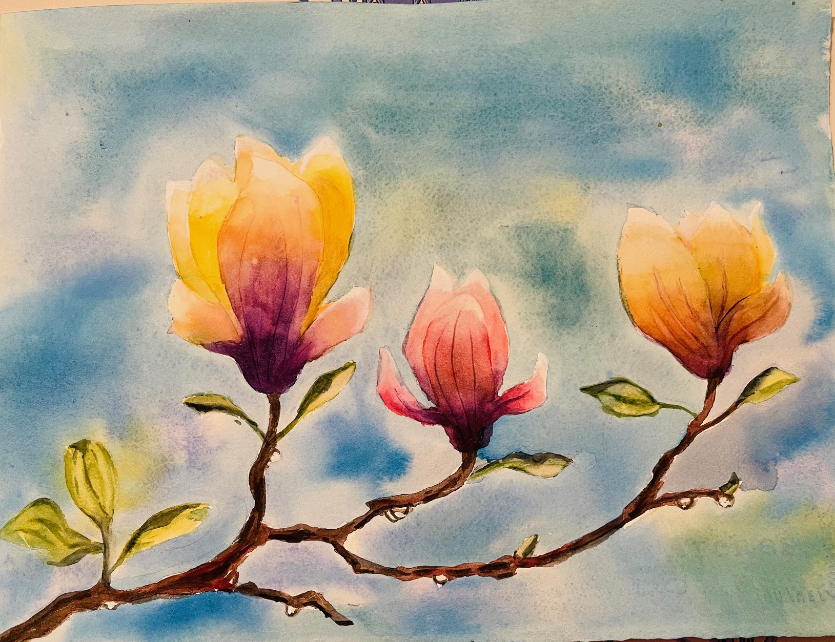 Voici une aquarelle de fleurs récente, c’est notre thème à l’atelier en ce moment , le fond n’est pas assez foncé !