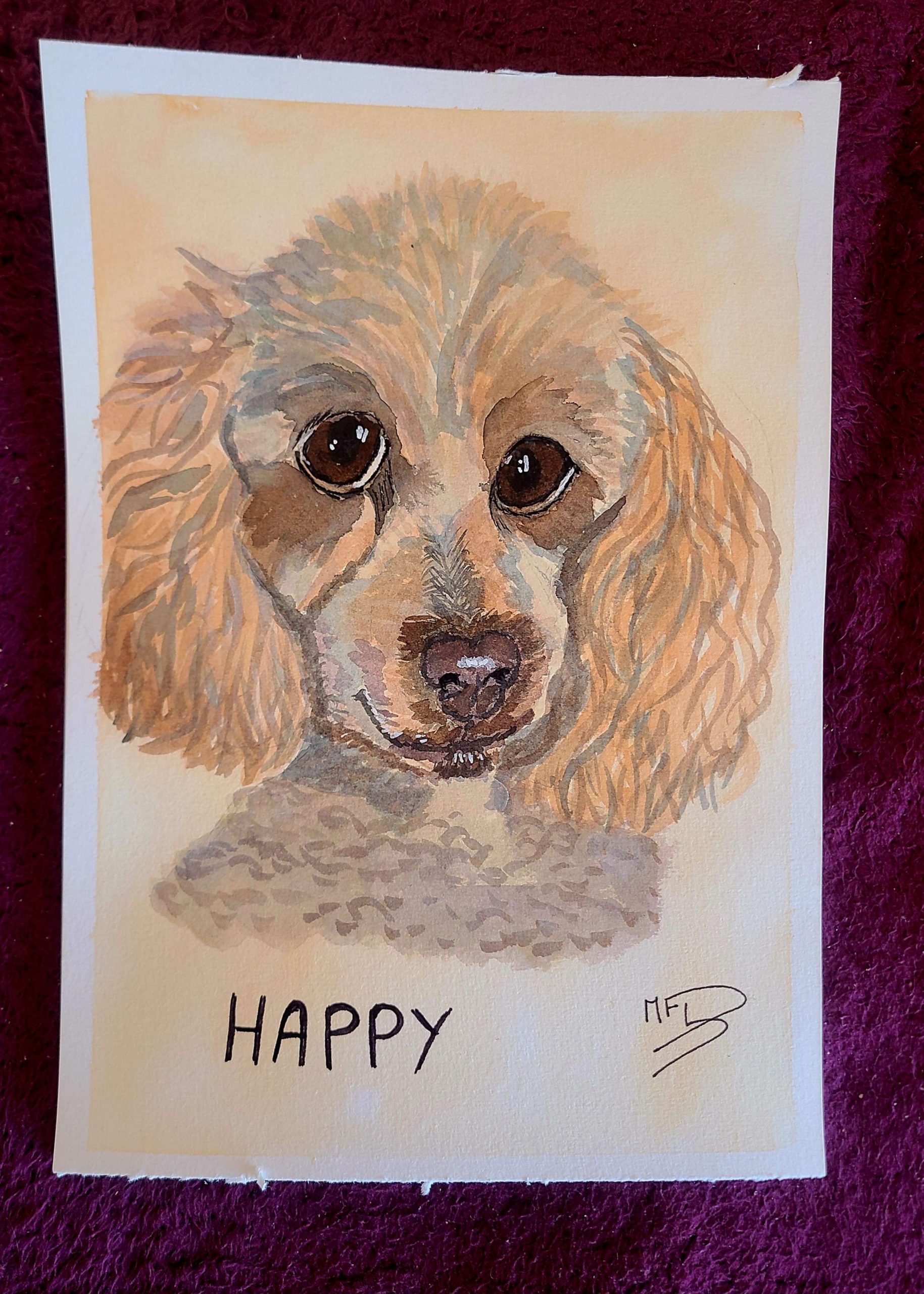 Bonjour voici ma petite chienne caniche Happy. J´ai déjà fait son portrait au pastel sec mais c´est la première fois que je le réalise à l´aquarelle.