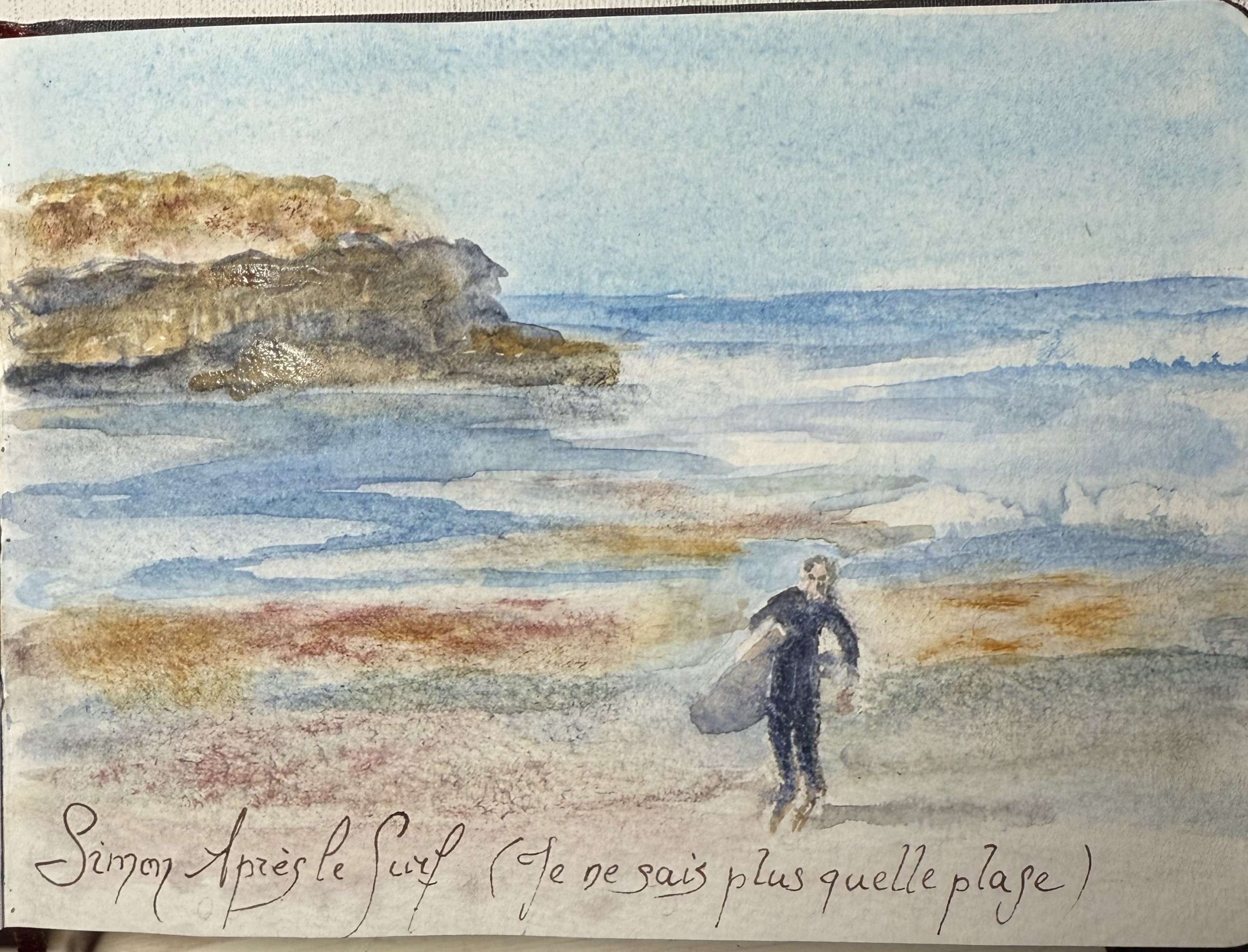 Très belle aquarelle et instructive, il faut un peu de temps pour s’habituer à un nouveau papier , 😉 tes ombres sur la plage me font plus penser à des rochers ou des rampes d’accès , j’aime bien l’écriture du titre