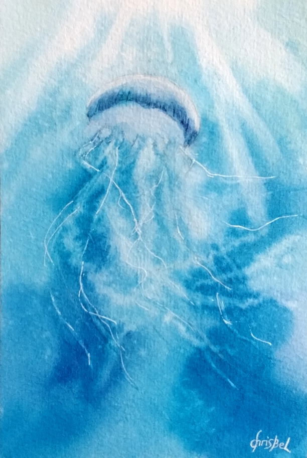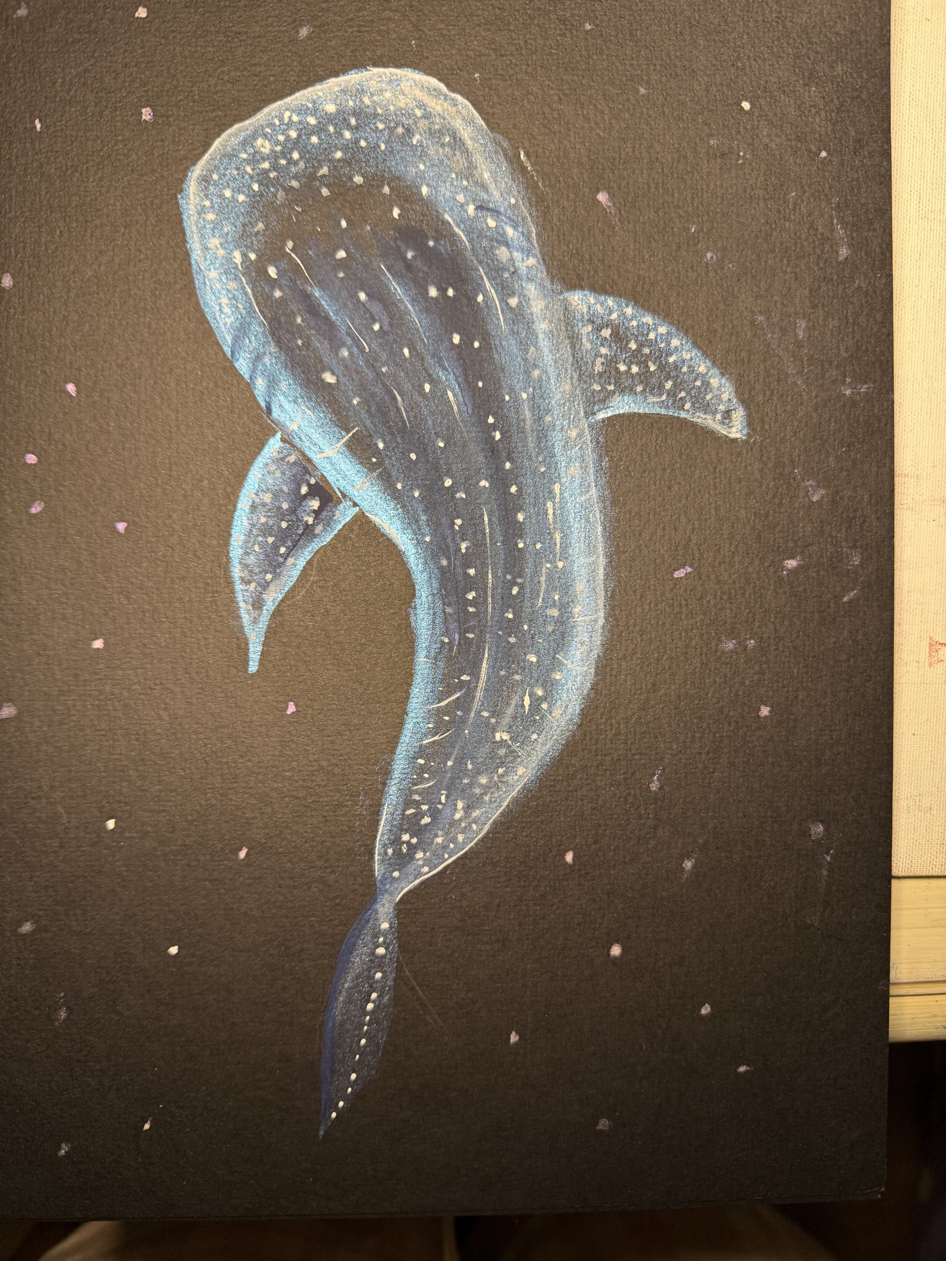 J’ai essayé le requin baleine de Cindy avec l’aquarelle métallisée et la gouache, j’ai trouvé difficile d’associer les 2 médias , le résultat est plutôt brouillon, je me suis « mélangé les pinceaux « c’est le cas de le dire, je réessaierai….