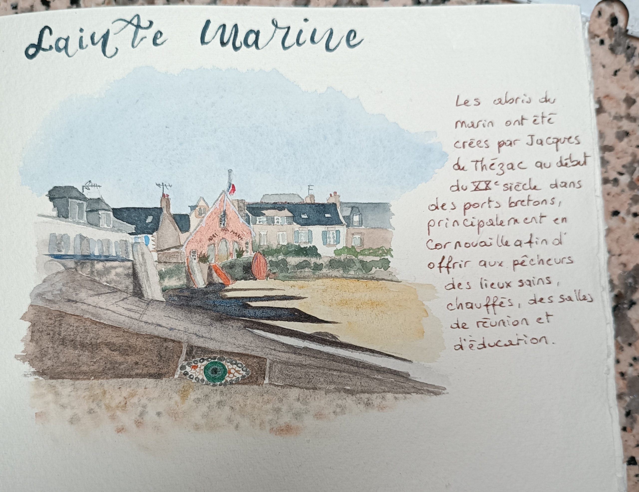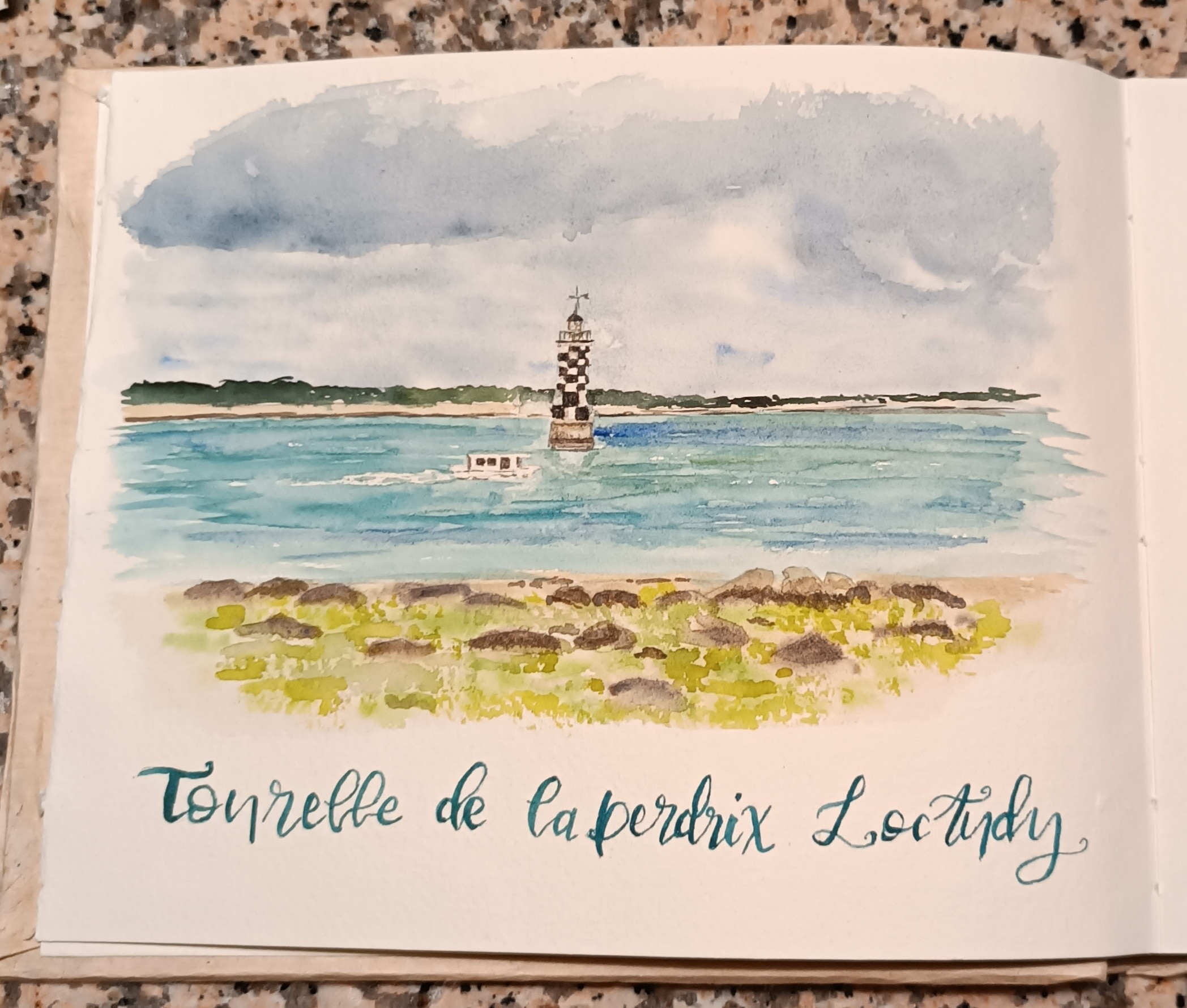 Coucou, pour changer un peu des cartes de Noël, j’ai peint ce petit paysage de Bretagne sur un carnet Khadi que je démarre. Un peu carnet de voyage mais pas tout à fait. Alors, le papier est assez bizarre, l’eau reste longtemps en surface avant d’être absorbée. J’ai vraiment du mal avec les ombres. Celle sur la plage est trop trop noire.