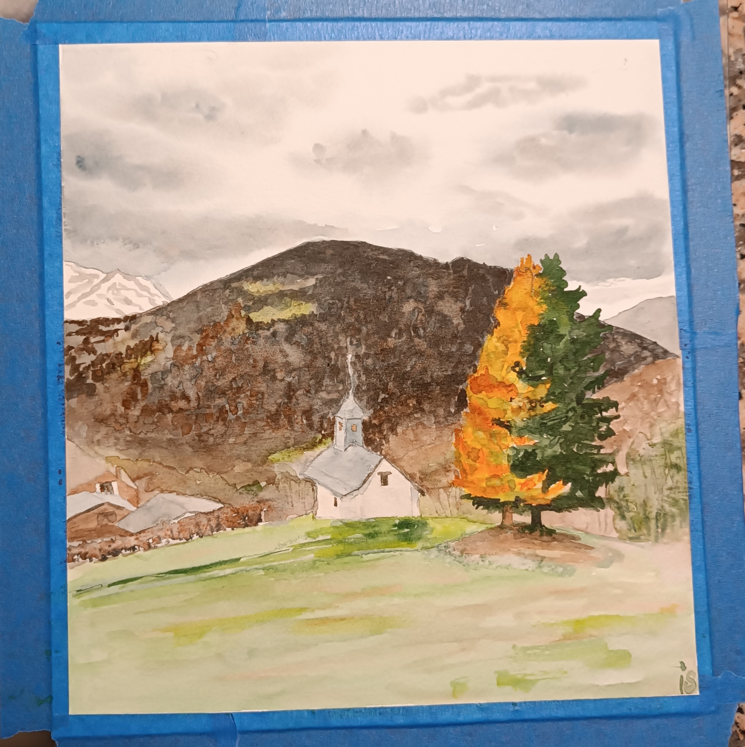 Pas évident de faire des grands aplats avec la chapelle qui est plus claire, j’aurais peut-être dû utiliser du masking fluid.