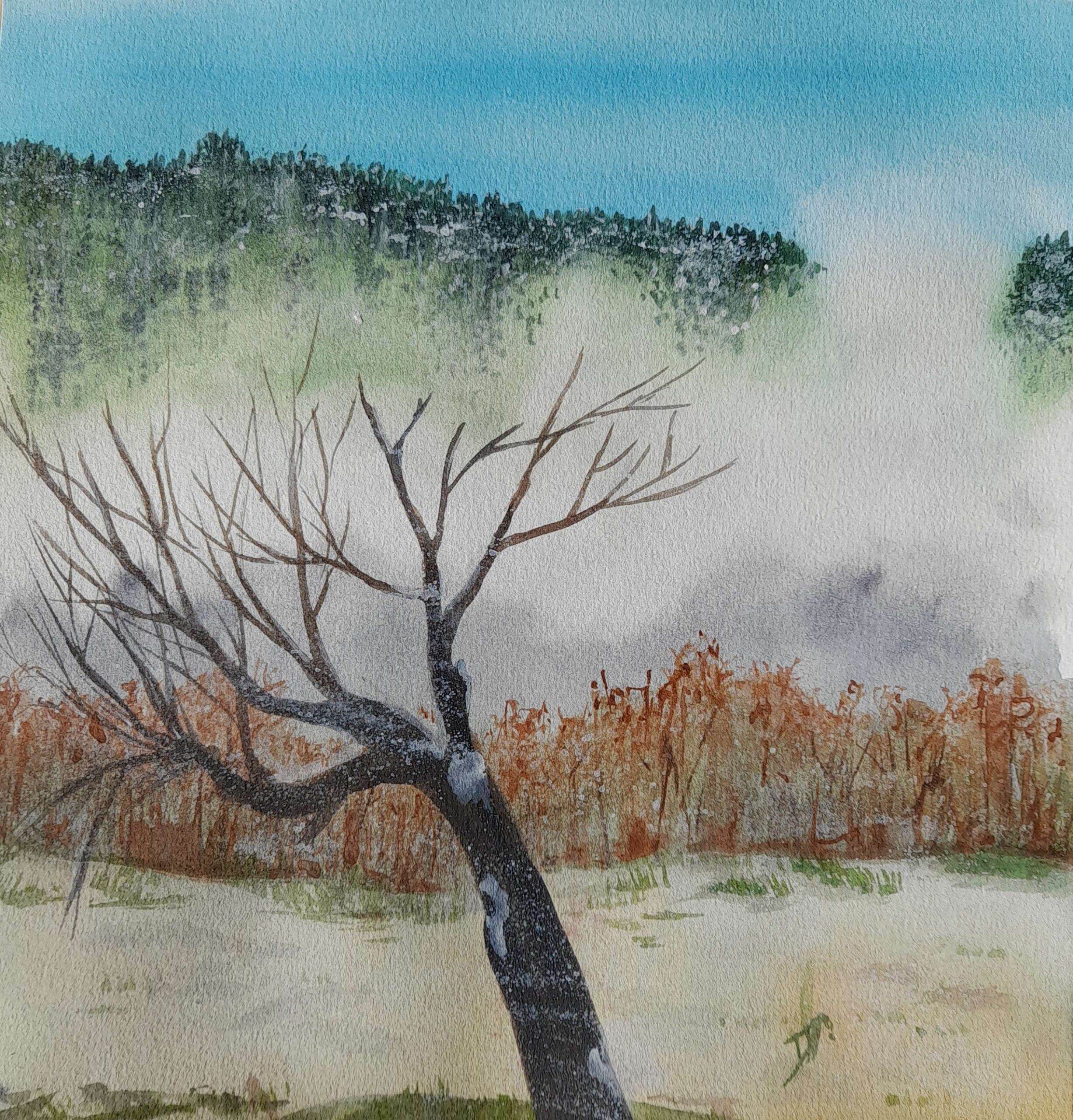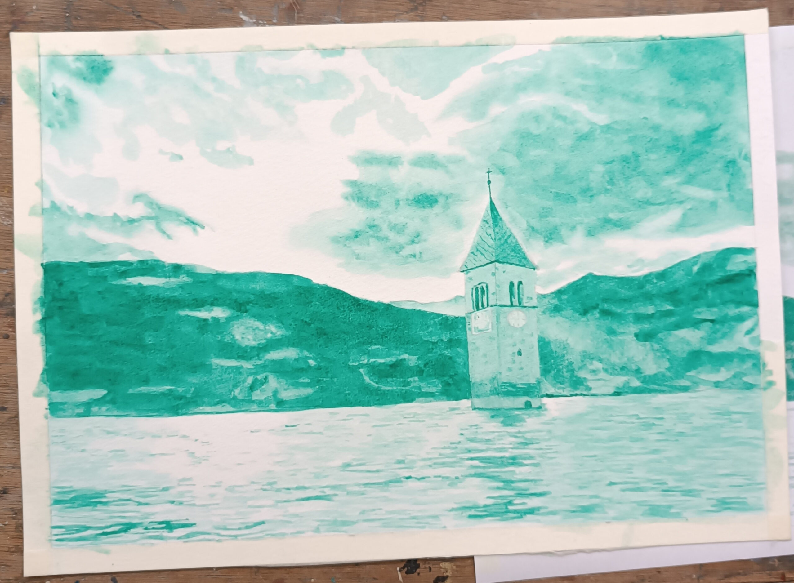 Bonsoir, je suis retournée à mon cours d’aquarelle du vendredi. J’avais terminé cette peinture la dernière fois. Elle a été réalisée d’après une photo récupérée sur internet. Elle représente le clocher de Curon, en Italie, qui émerge de la surface du barrage construit sur le site du village.