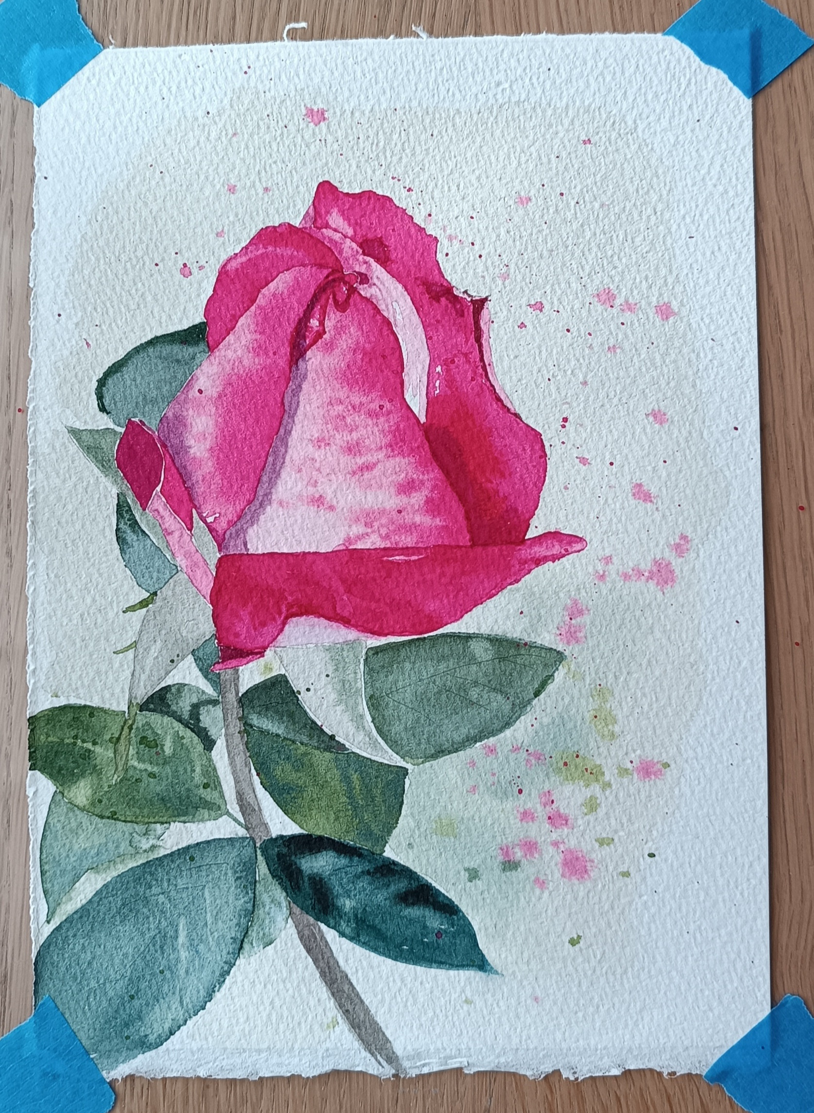 Cet après midi, j’ai peint une rose en vue de faire une carte d’anniversaire. Contrairement à des fois où je suis euphorique après ma peinture, là, je n’accroche pas mais je ne sais pas pourquoi. Elle colle assez bien à la photo, un peu trop imposante peut être, il y a autre chose qui cloche mais quoi ?