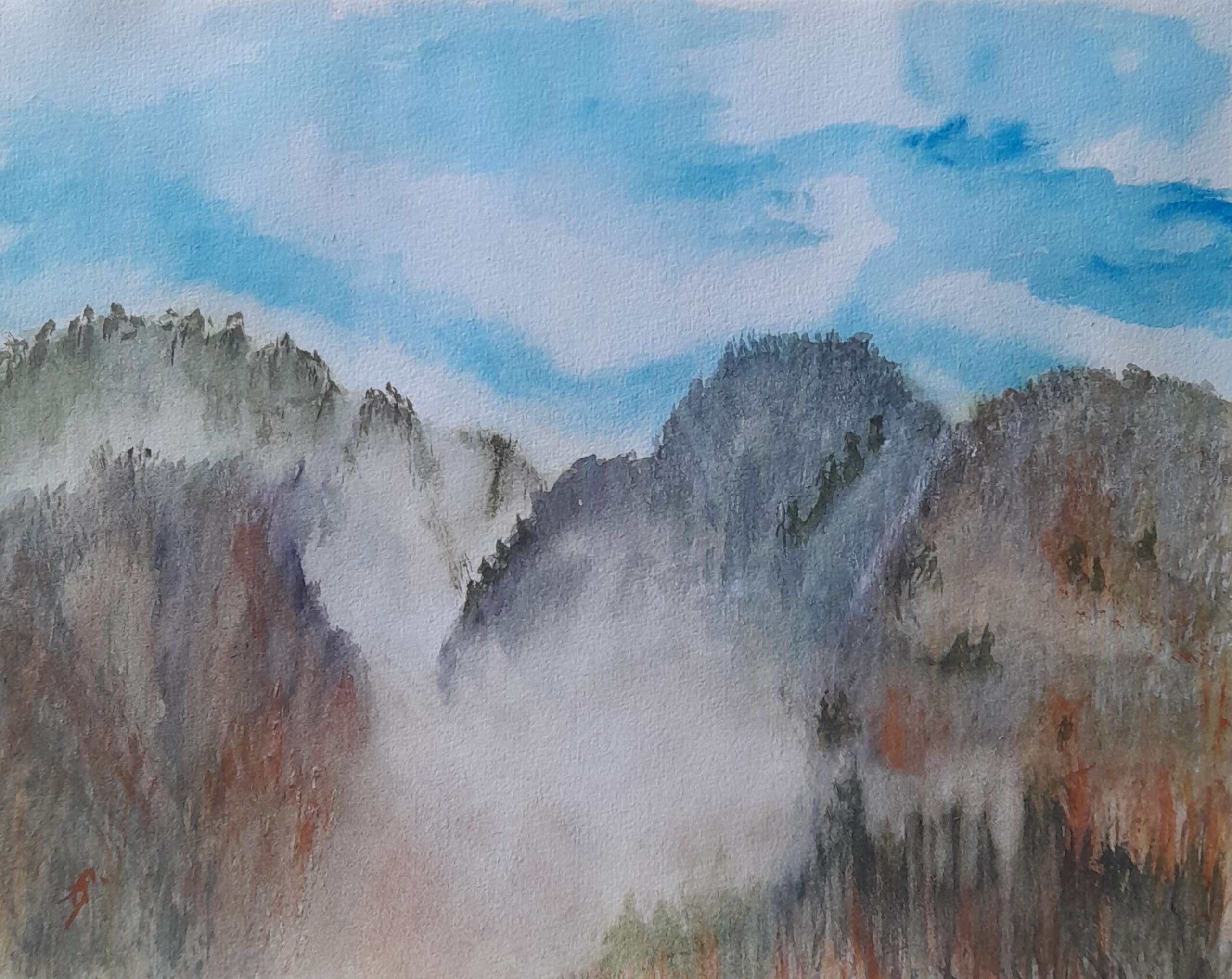 Coucou, d’après une vue magnifique du salon, j’ai vite mis tout mon matériel sur la table, le paysage avait déjà changé, comme toutes les 5 mns. J’ai dû improviser en respectant l’ambiance brumeuse. Malheureusement pas su rendre la luminosité à certains endroits de la cime des montagnes. A faire et refaire… bon week-end.