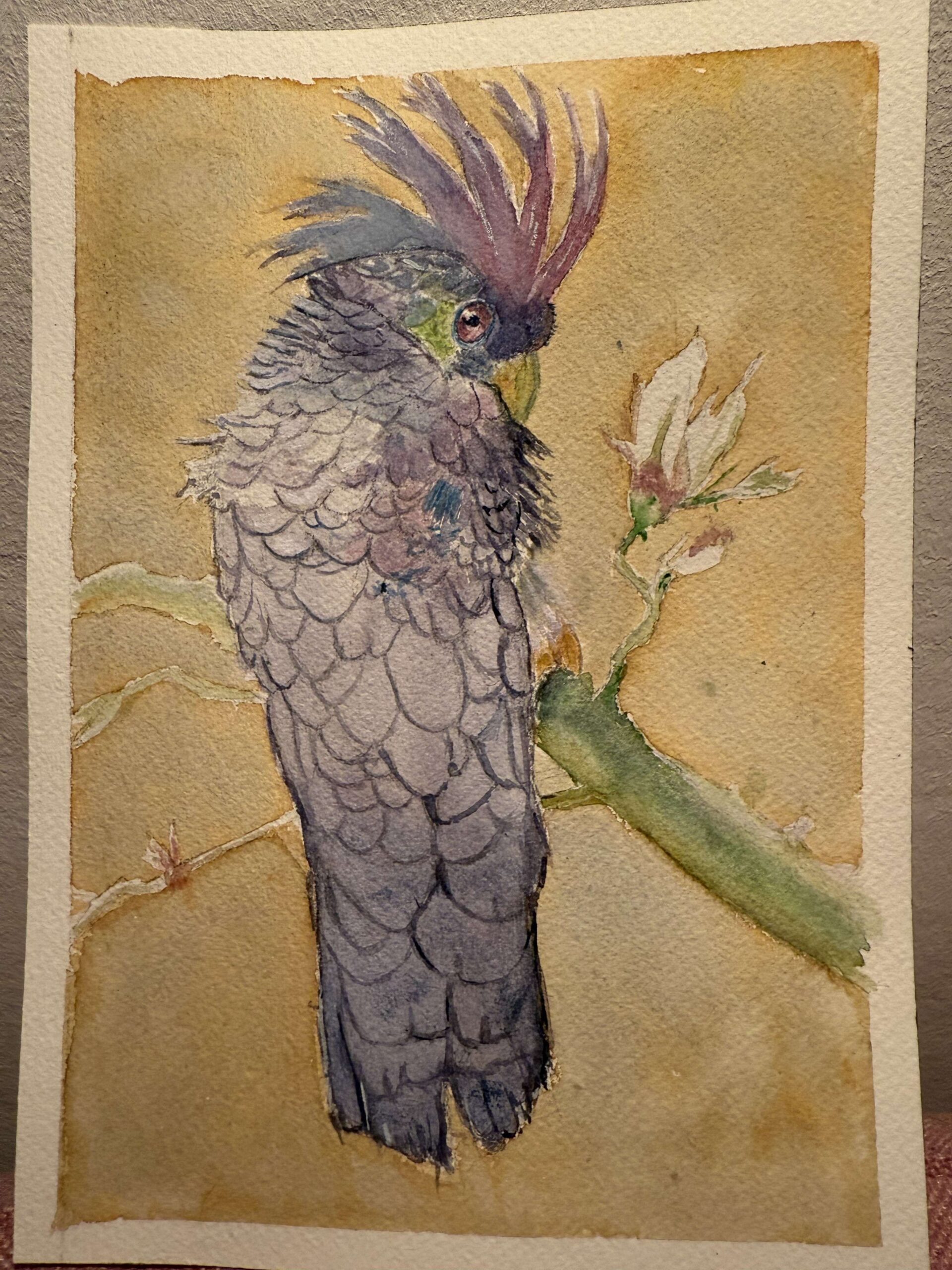 Quand même, il est super beau ce perroquet, tu as vraiment bien fait les plumes. S’il fallait changer quelque chose, peut être qu’un fond dans les tons de vert le mettrait encore plus en valeur ?