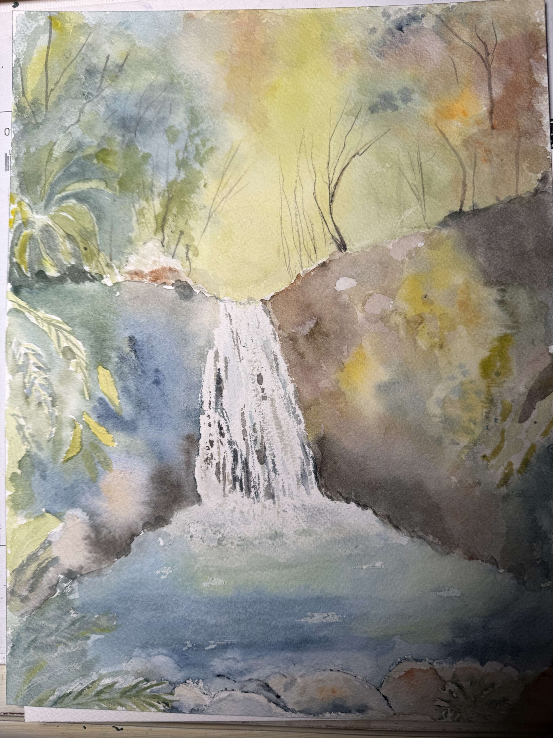 Je la trouve très réussie, ta 1ère cascade. Les couleurs autour donnent un effet de monde magique, j’aime beaucoup. Concernant le drawing gum, sur papier cellulose, je trouve qu’il est difficile à enlever mais je n’ai pas souvenir d’avoir eu ce problème avec du papier coton.