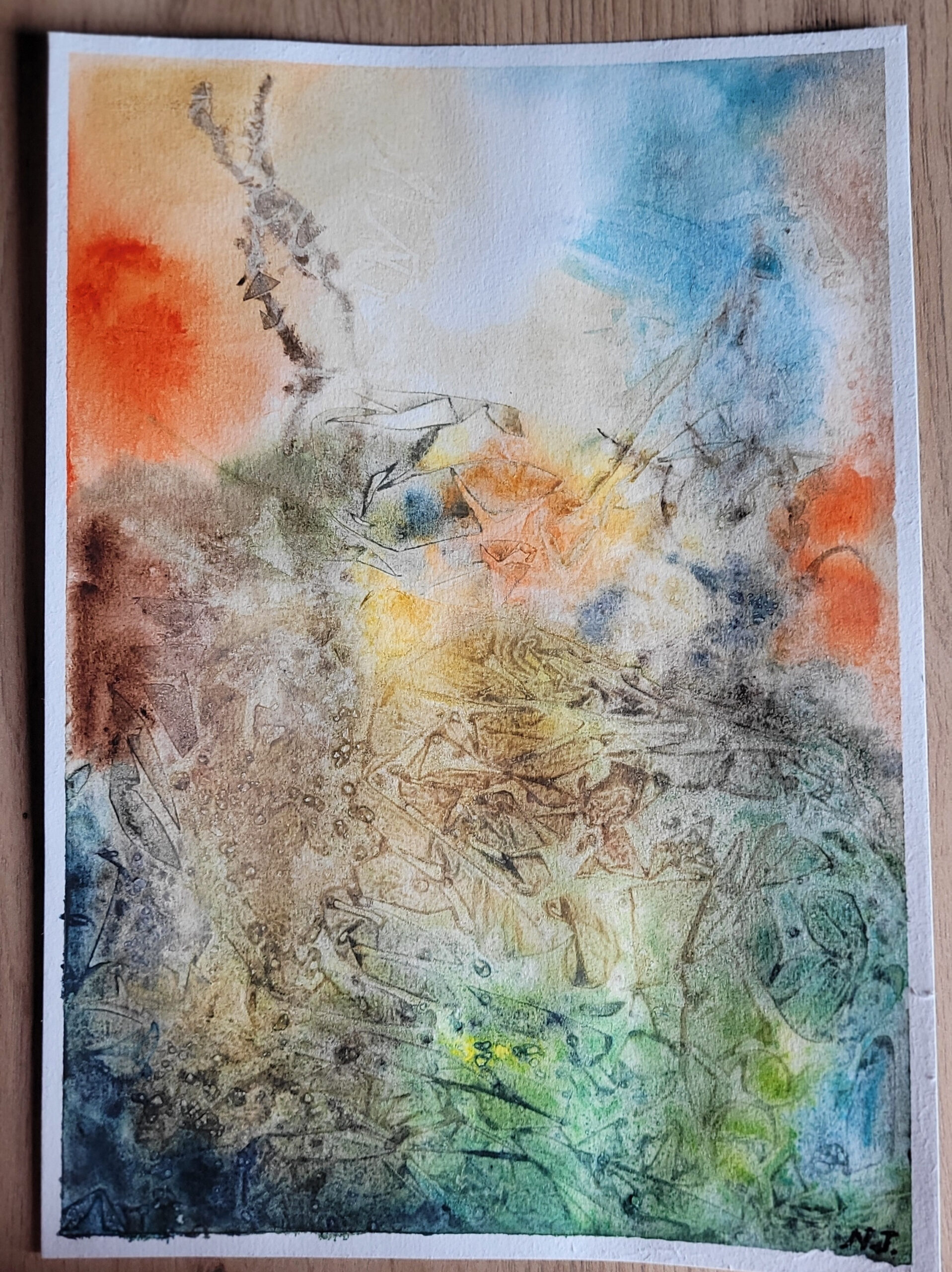J’aime beaucoup Nathalie, n’ai pas encore osé me lancer dans l’abstrait…. Un tort…ton aquarelle rend bien! je voius un papillon sans chercher à reconnaitre quoi que ce soit. Par contre la base me fait penser à une bougie, c’est ce que tu as voulu représenter ?