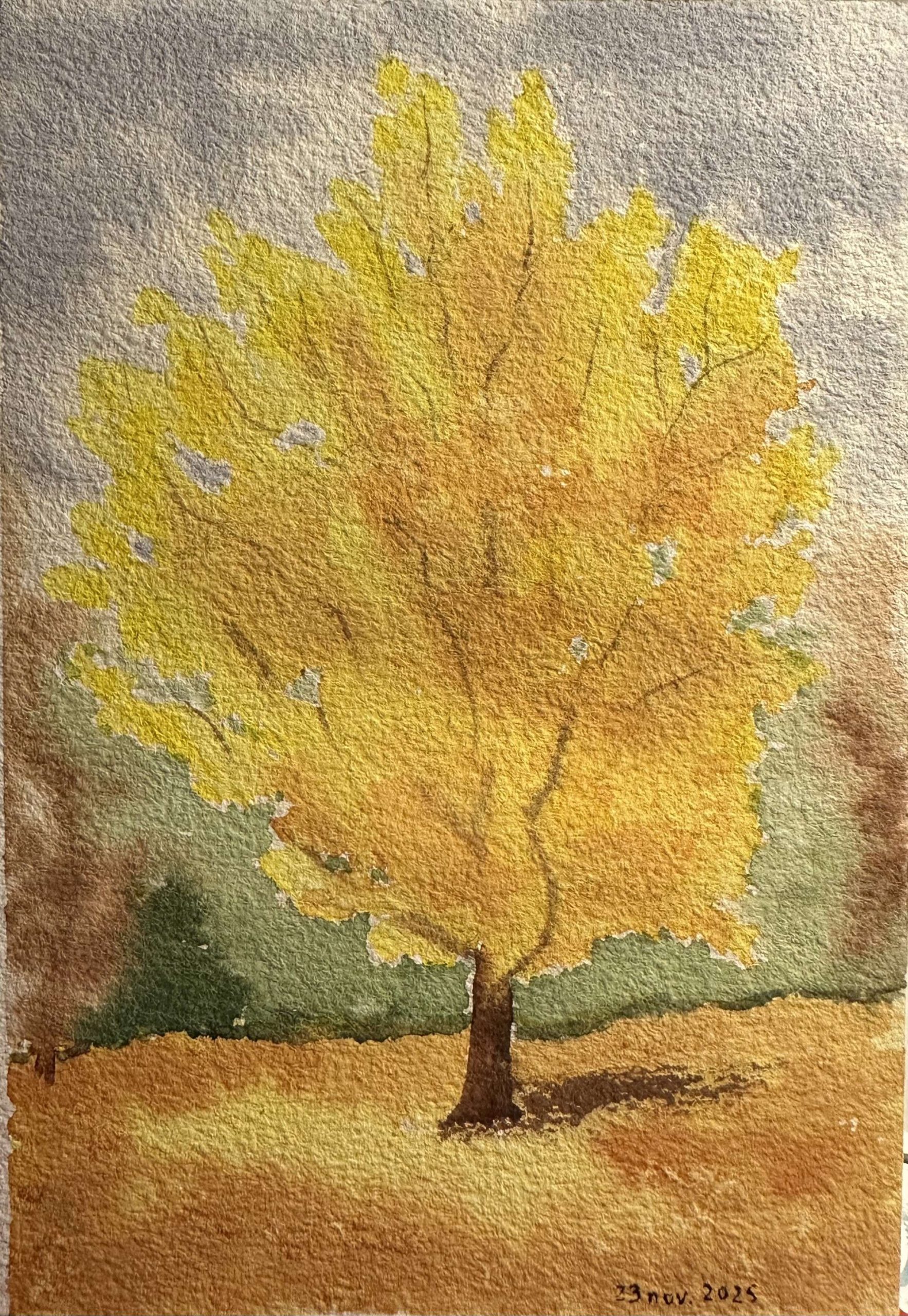 Ah je ne savais pas c’est intéressant ça 🤗 pour le ginkgo j’ai utilisé une technique de brigand 😅, j’avais repéré le feuillage clair au crayon jaune aquarellable, avec des formes grossières comme Cindy l’a fait et les branches avec un marron 🫣😇 c’était un essai, le crayon ne se dissout pas intégralement mais le jaune ne se voit pas, il a vite disparu même, c’est un bon entraînement pour se libérer de l’esquisse en douceur 😅, et le marron a été recouvert