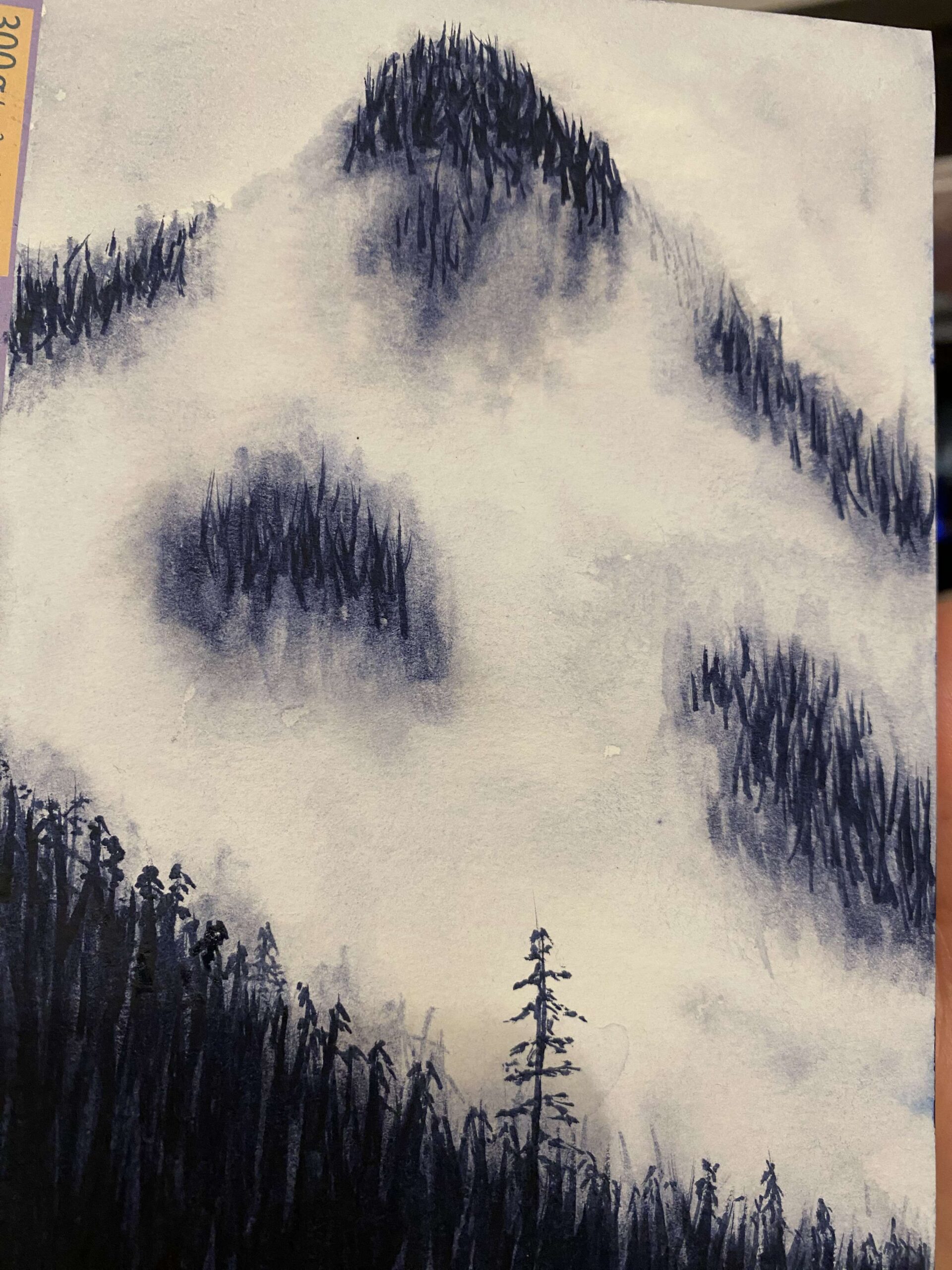 Pourquoi moins moche ? Ton paysage est réussi, la montagne se dessine bien sur fond de brouillard et de forêts de sapin. J’aime bien la petite zone au milieu dans laquelle tu as ajouté du bleu, à moins que ce soit le noir qui s’est déphasé ? En tout cas, cela rend très bien.
